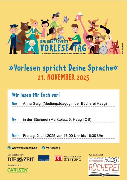 Am 21.11.2025 um 16:00 Uhr feiern wir den Bundesweiten Vorlesetag. Unter dem diesjährigen Motto „Vorlesen spricht Deine Sprache“ tauchen wir gemeinsam in das japanische Bilderbuch „Das Tomatenfest“ ein. Der Eintritt ist kostenlos, eine Anmeldung ist nicht erforderlich. Wir freuen uns auf euren Besuch!